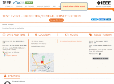 Note the QR code! All events feature a unique QR code which when scanned will bring users to the public Event View page. This QR code is visible on both the Manage Event page, and the public Event View page. This code can be shared with users as needed.
